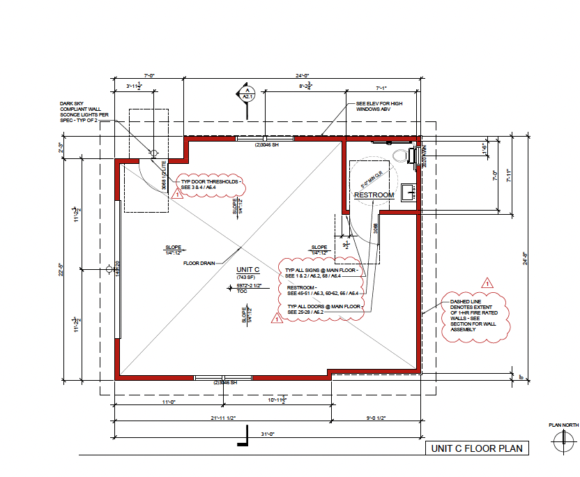Unit C is an industrial work space with an out door storage area, 1 parking space, 14′ x 14′ garage door, bathroom, and Reznor forced air heat.